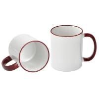 Deze sublimatie mok is gemaakt van wit keramiek en heeft een gekleurde binnenkant, rand en of handvat.